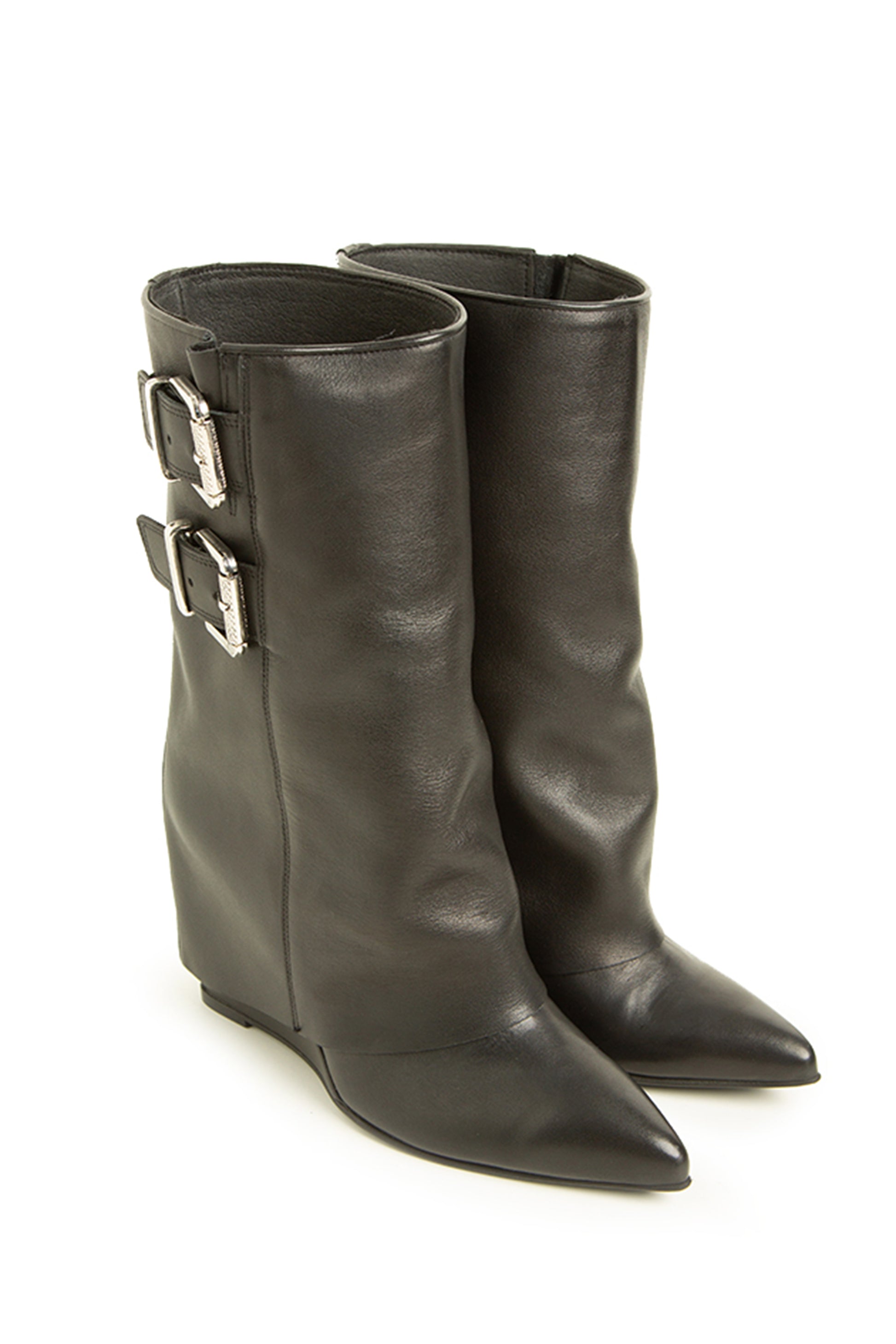 Botas pretas em pele verdadeira da BSB, com salto interno em cunha e duas fivelas metálicas laterais que acrescentam um toque moderno e arrojado. De bico fino e cano médio, são ideais para conjugar com vestidos, saias ou calças justas. Um modelo versátil e elegante que combina sofisticação e conforto para o dia a dia ou ocasiões especiais.