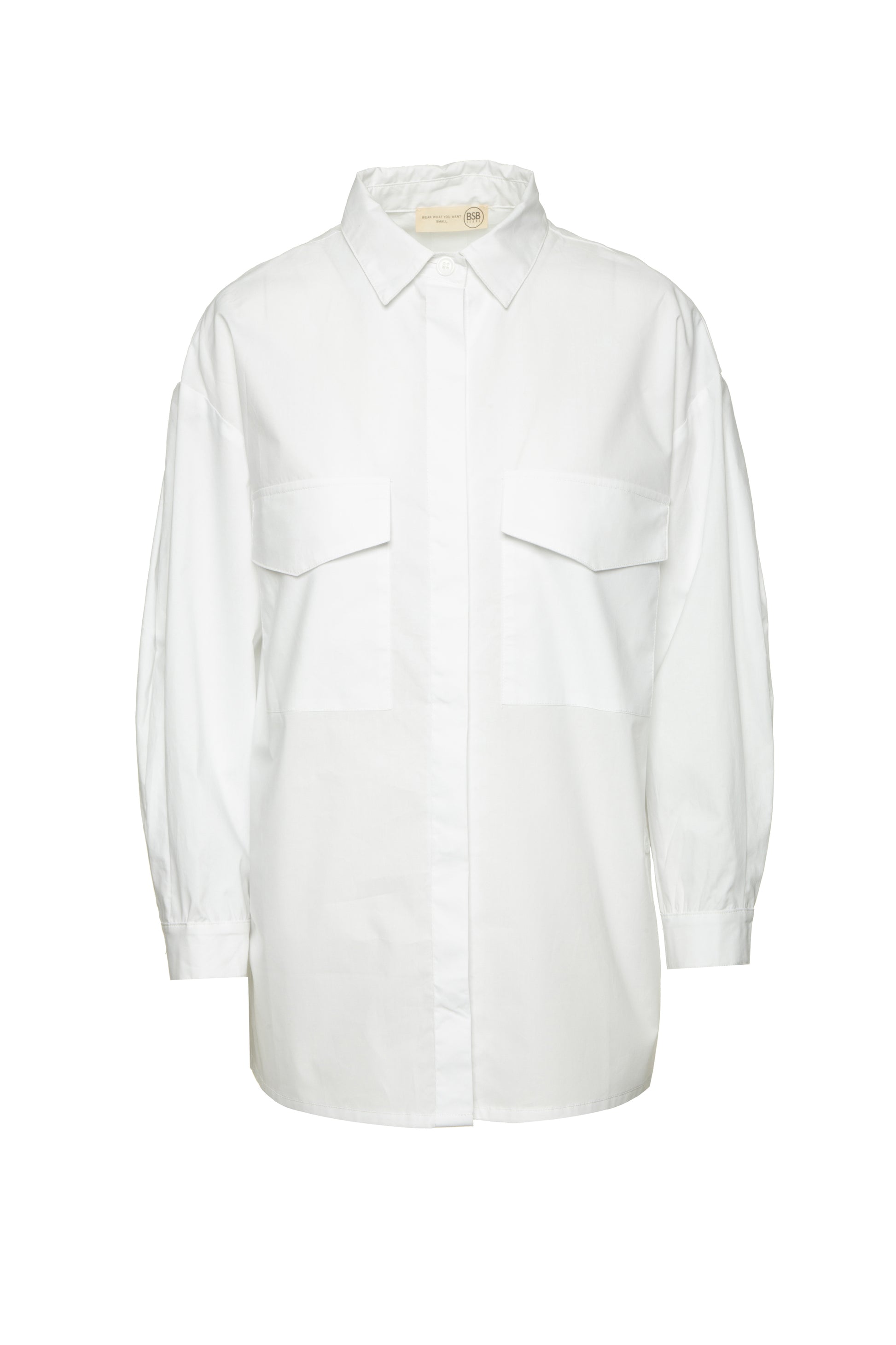 Camisa BSB em branco puro, com corte oversized e estilo minimalista. Confeccionada em tecido de algodão estruturado, apresenta bolsos frontais de aba, gola clássica e fecho oculto por botões, garantindo um visual limpo e elegante. Versátil e atemporal, pode ser usada solta para um look descontraído ou por dentro das calças para um toque mais sofisticado — perfeita tanto para o dia a dia como para ocasiões formais.