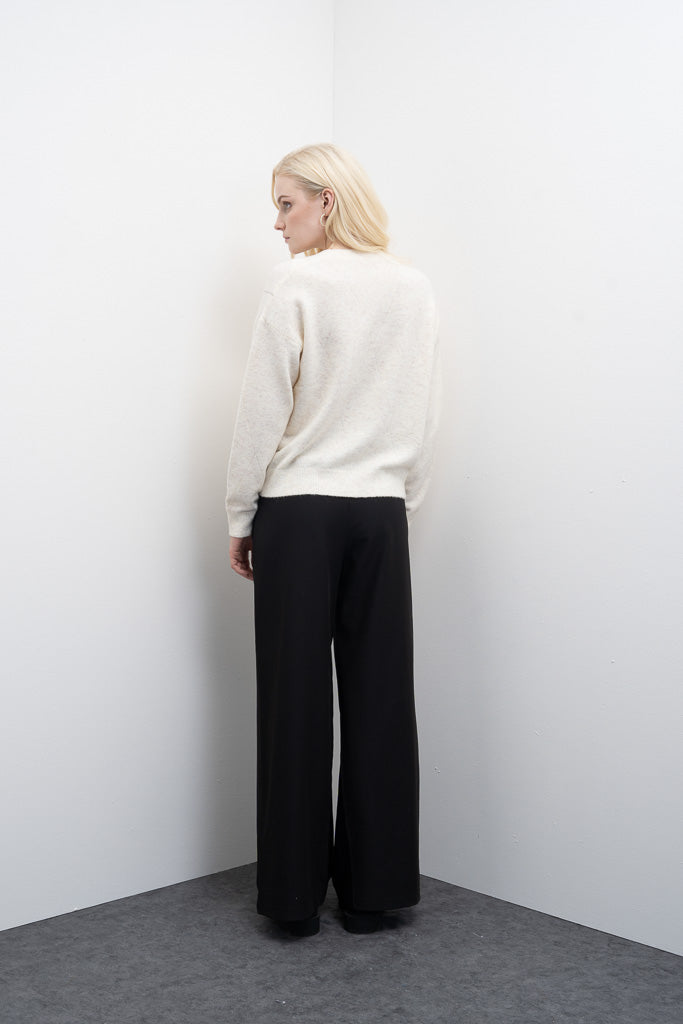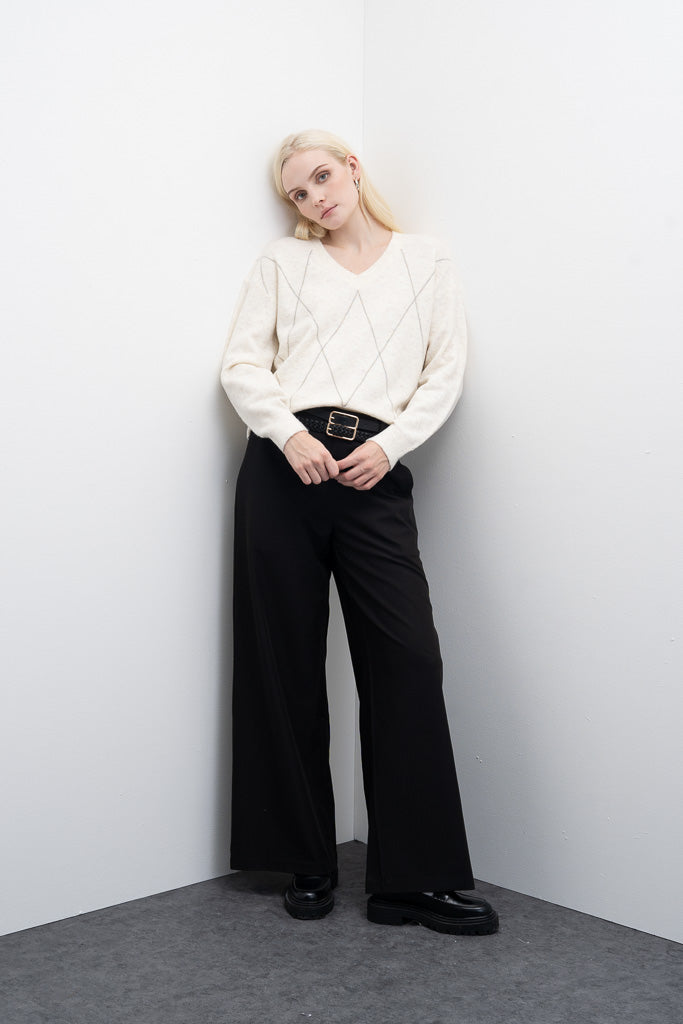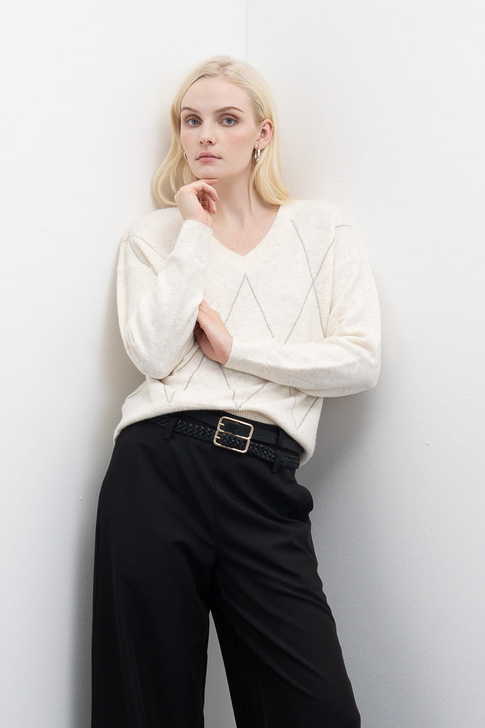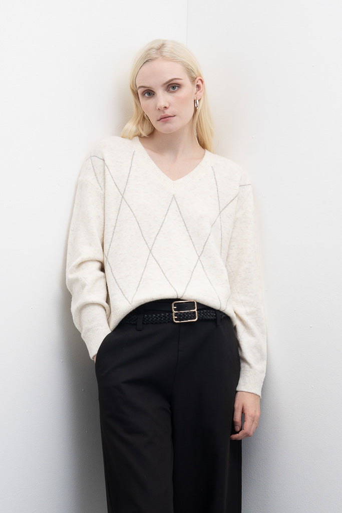 Camisola em malha com padrão de losangos em tom suave e decote em V, que adiciona um toque clássico e elegante. Confortável e macia, é perfeita para o dia-a-dia, oferecendo um equilíbrio entre estilo e aconchego. Ideal para combinar com calças de alfaiataria ou jeans para um look casual-chique.