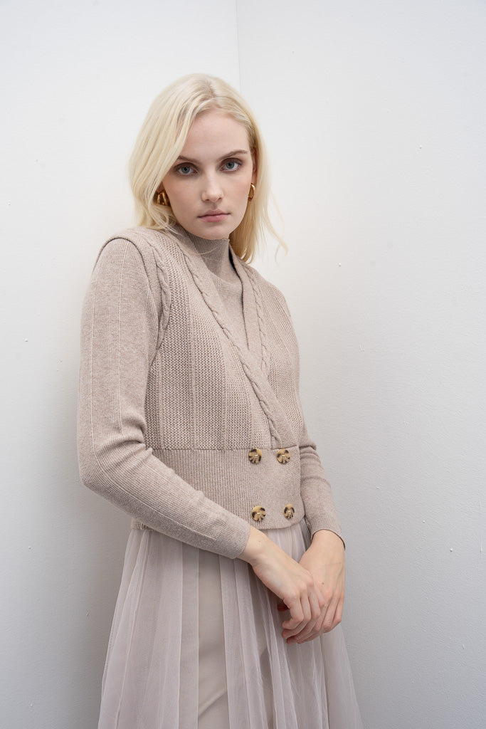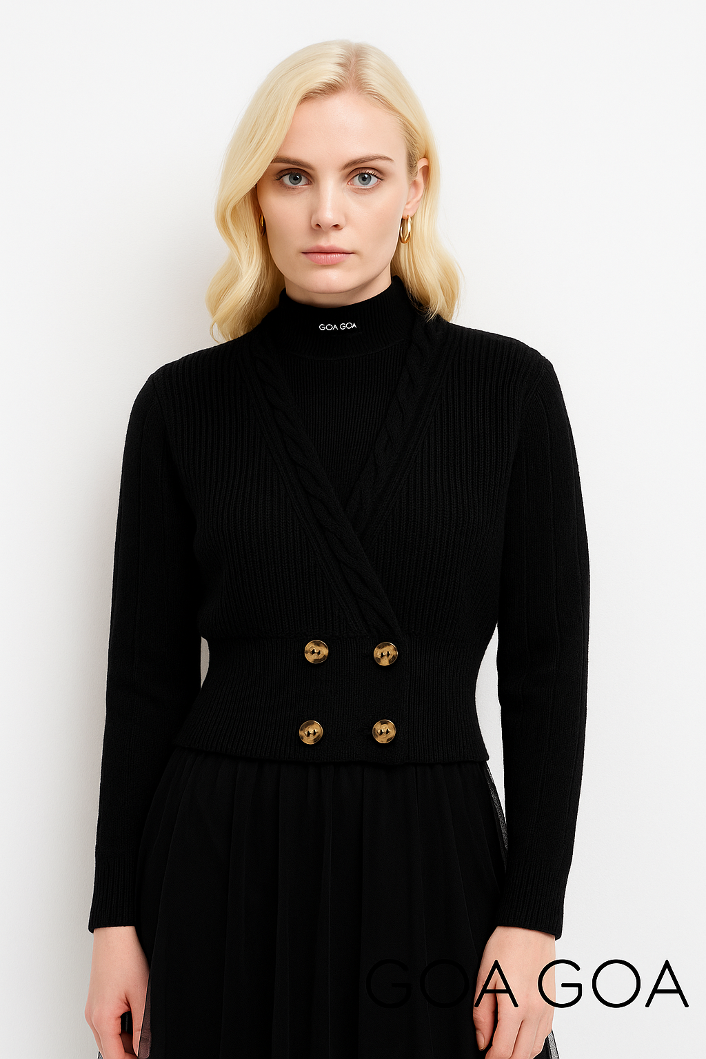 Camisola de malha fina com gola alta e detalhe cruzado na frente. O design elegante com botões decorativos confere um toque sofisticado e feminino, ideal para coordenados de outono e inverno. Combina conforto e estilo num só modelo, perfeito tanto para looks casuais como para ocasiões mais especiais.