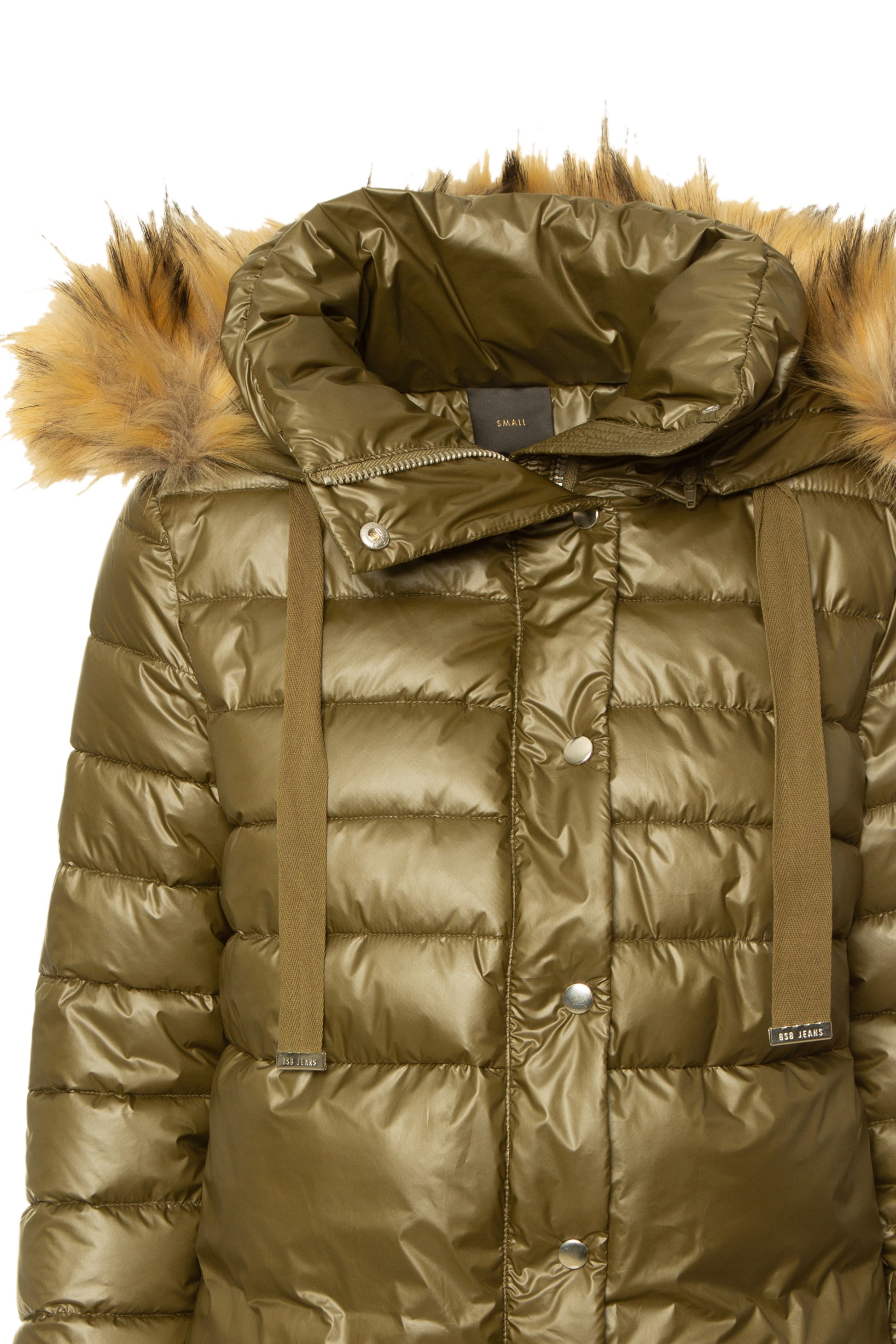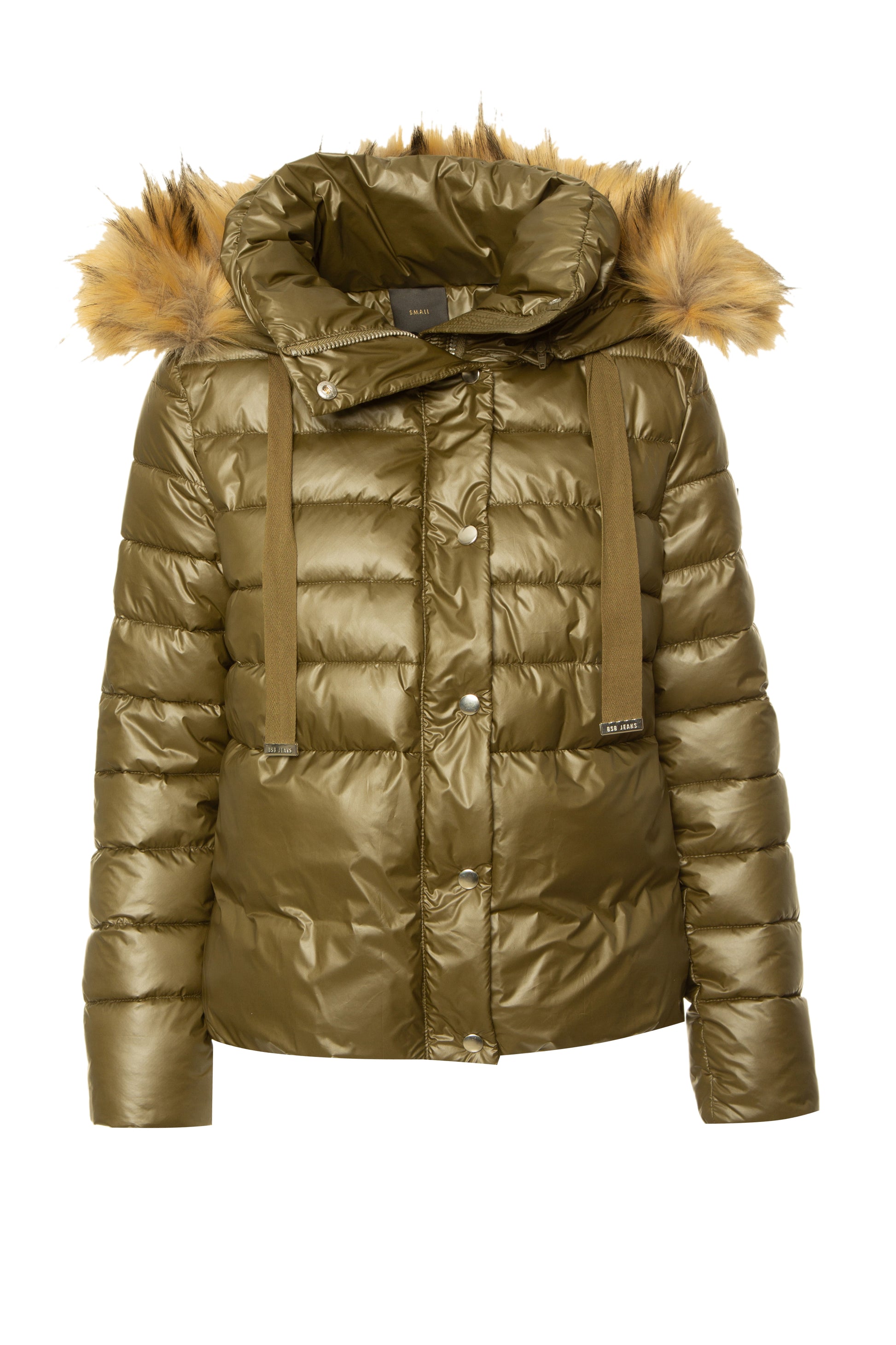Casaco acolchoado, com capuz forrado em pêlo sintético e fecho frontal com molas. Um modelo quente.