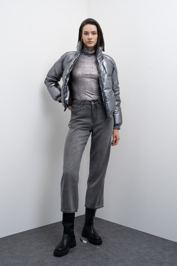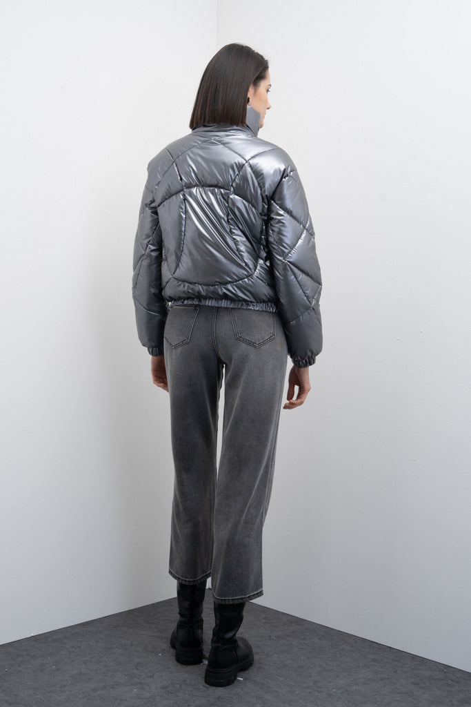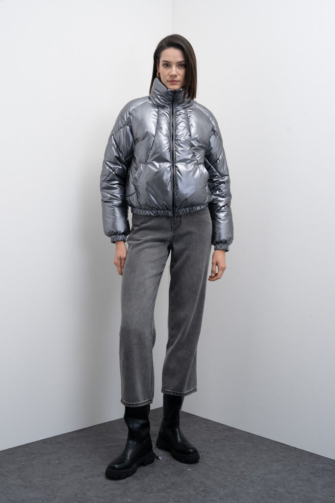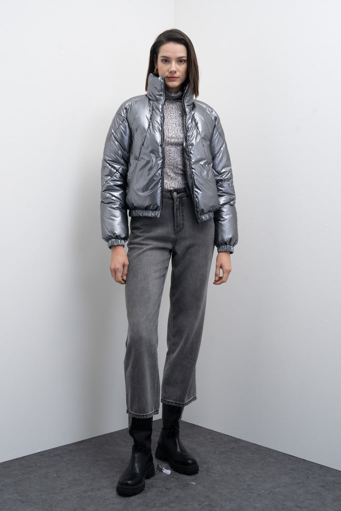 Casaco acolchoado de acabamento metalizado prateado, com gola subida e fecho frontal. Modelo curto de manga comprida com punhos e bainha elástica. Dispõe de bolsos laterais.