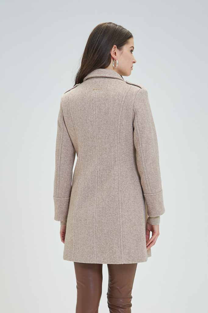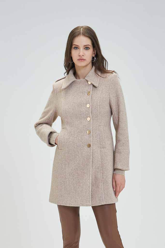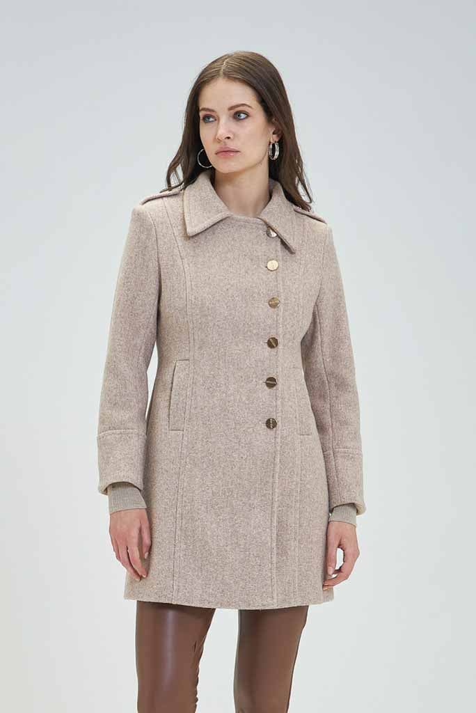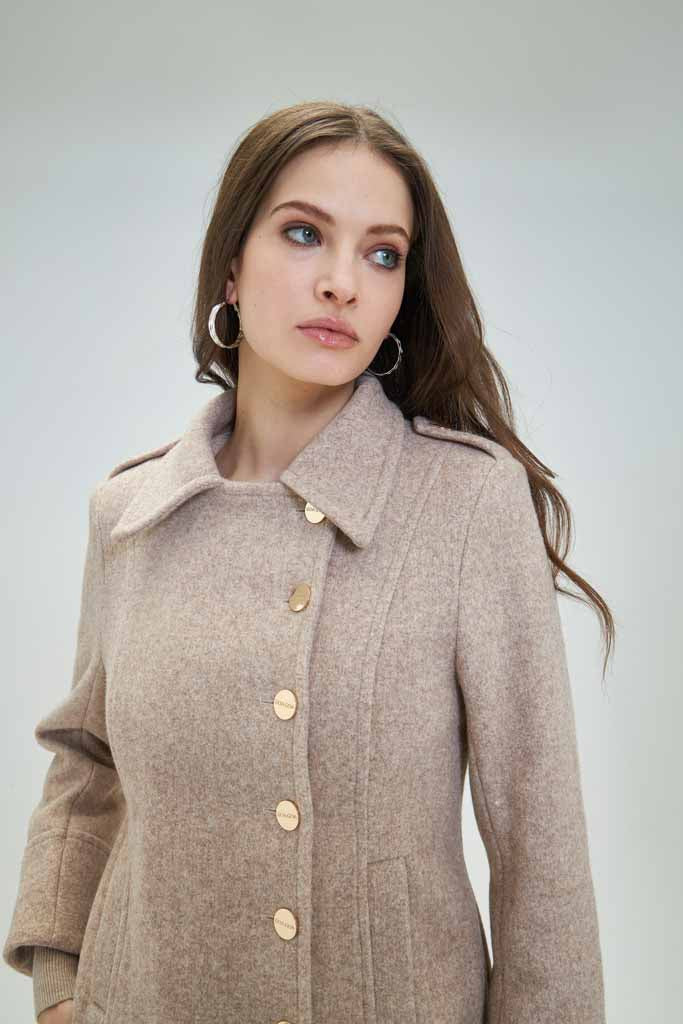 Casaco comprido, com gola clássica e botões dourados frontais. Detalhes nos ombros e bolsos laterais discretos completam o look elegante e intemporal.