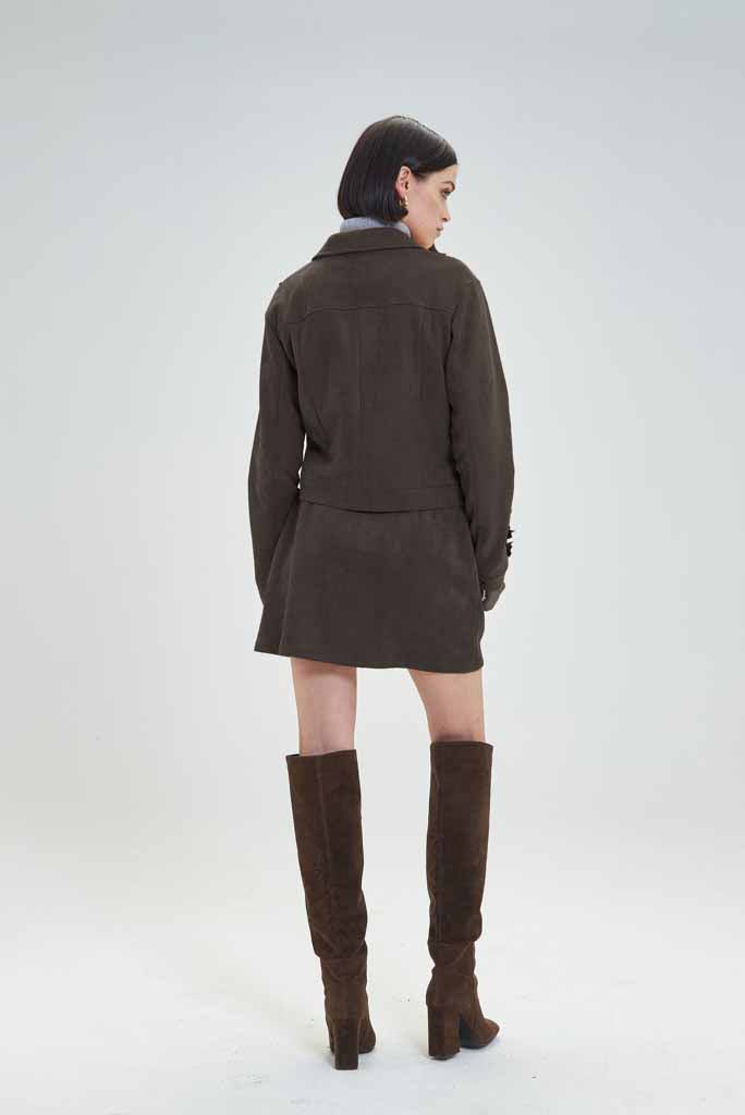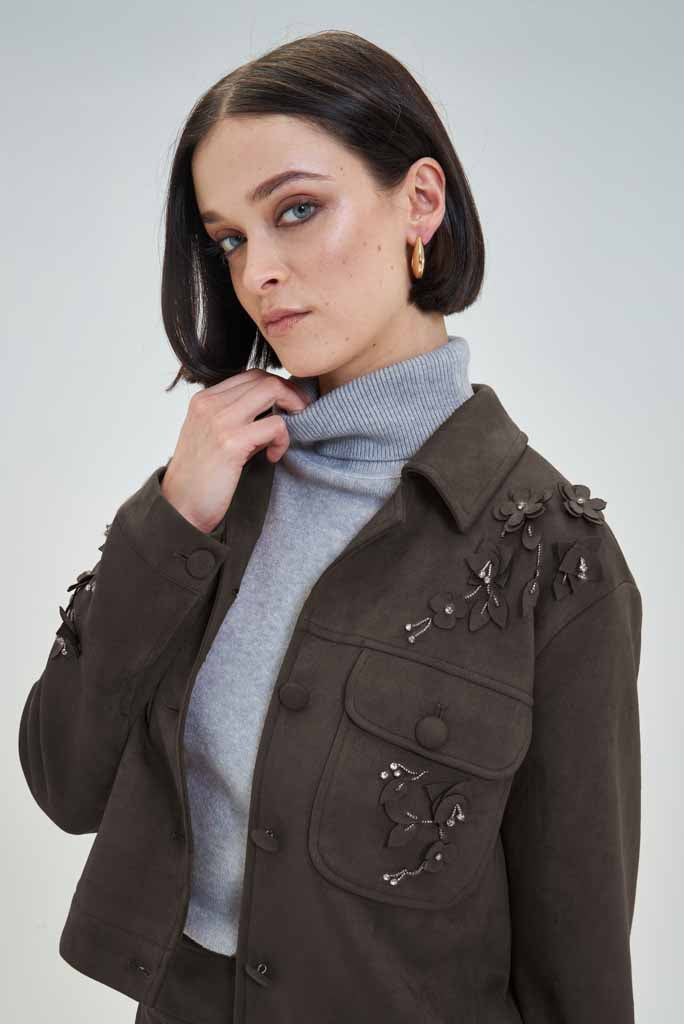 Casaco curto em tom chocolate, com detalhes florais bordados nos ombros e bolsos frontais. O design moderno com bolsos de aba e botões forrados confere-lhe um toque sofisticado e elegante, ideal para combinar com saias, calças ou vestidos. Perfeito para looks de outono e inverno, mantendo o equilíbrio entre estilo e conforto.