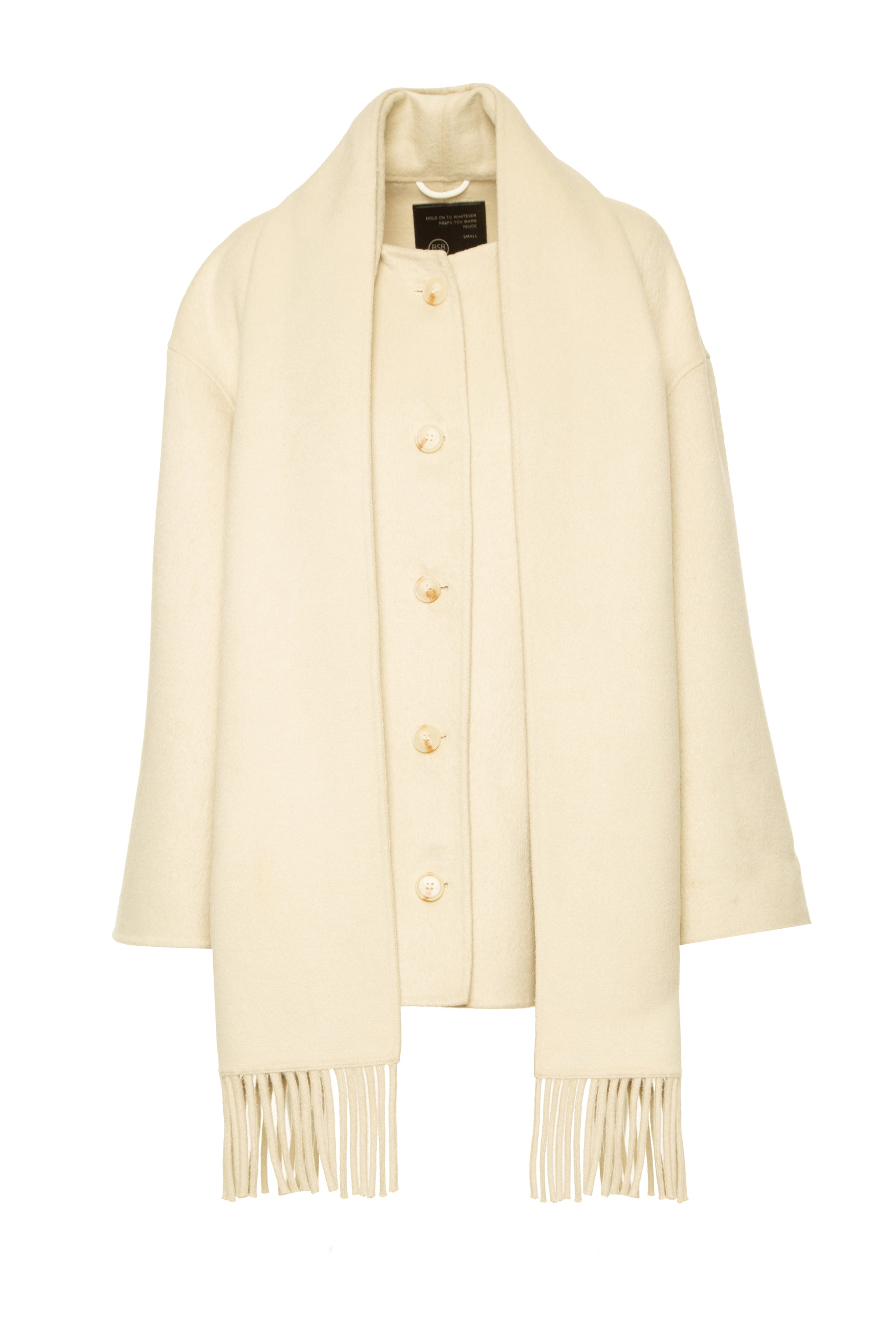 Casaco de lã em tons neutros. Corte regular. Botões para abertura na frente. Com pormenor de cachecol que faz parte do casaco.