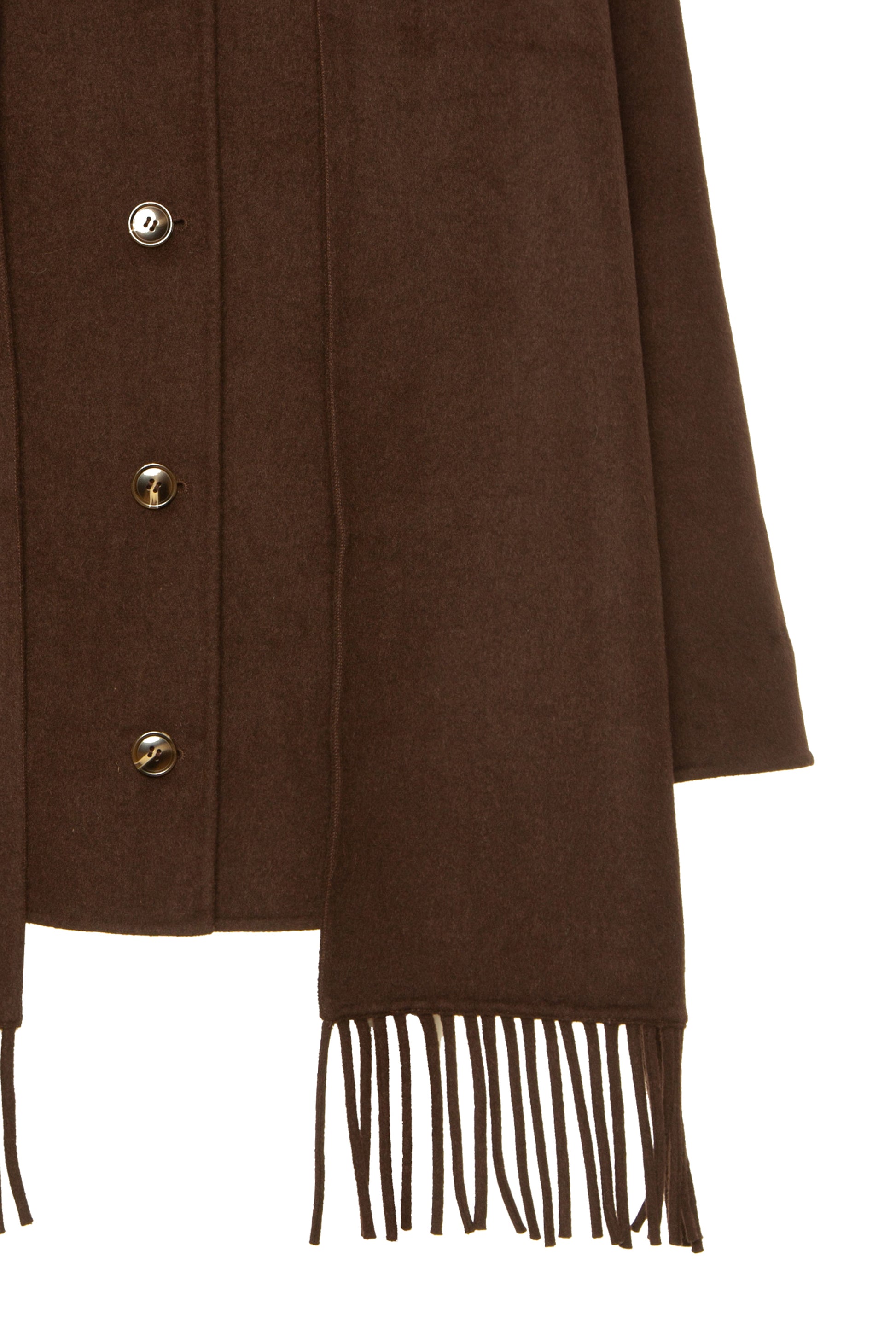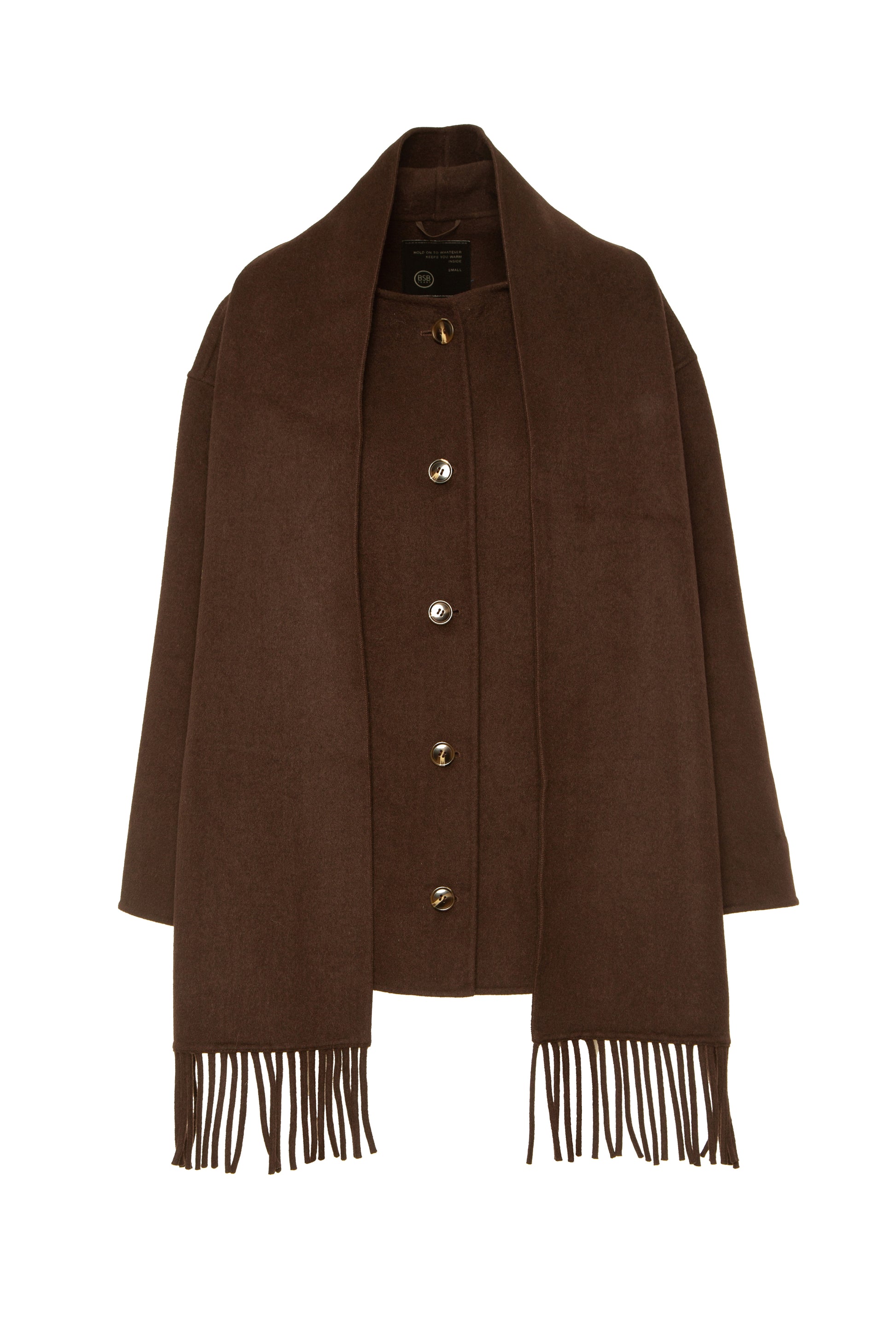 Casaco de lã em tom chocolate. Corte regular. Botões para abertura na frente. Com pormenor de cachecol que faz parte do casaco.