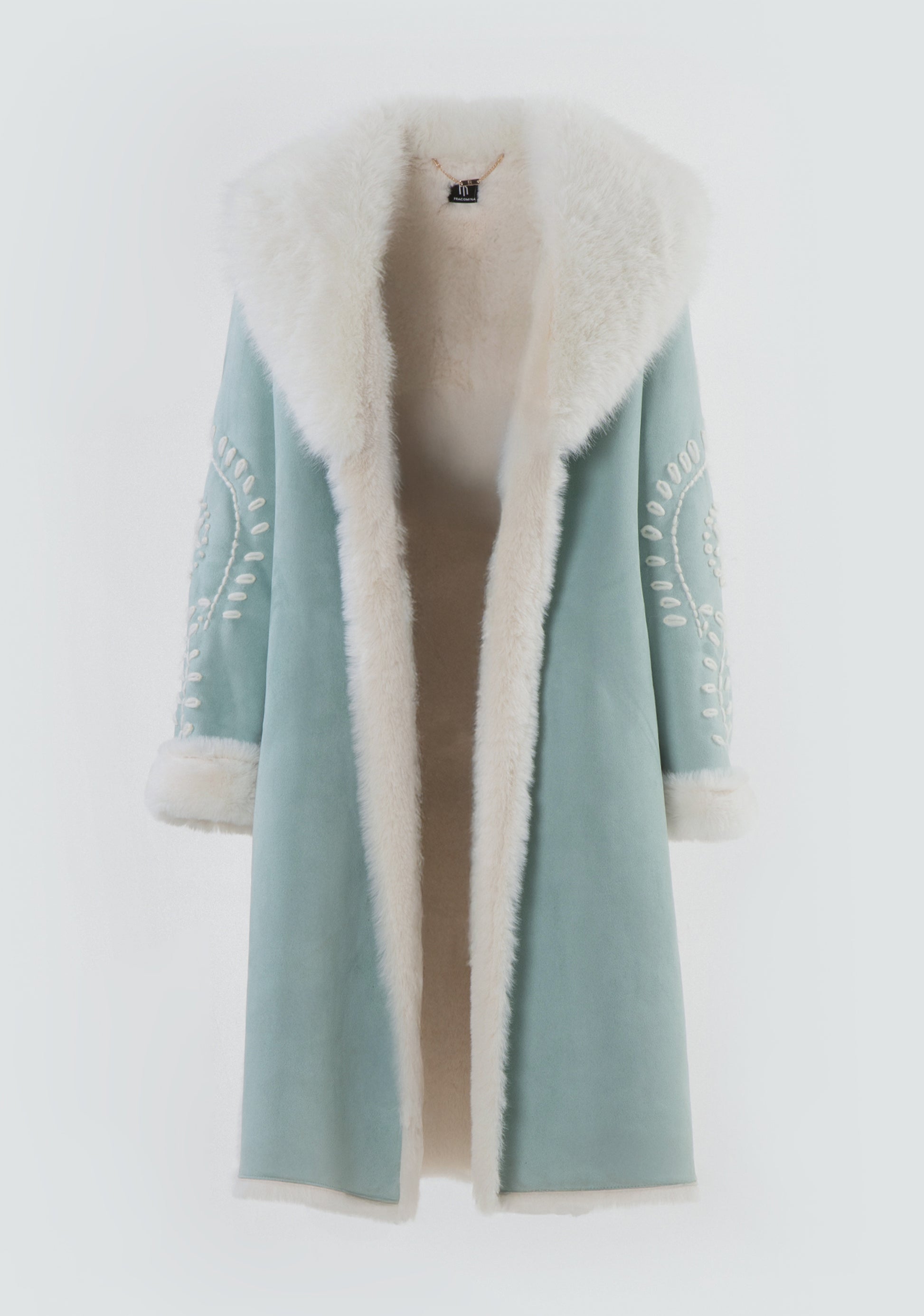 Casaco longo em azul claro, com forro e gola em pêlo sintético e detalhes bordados nas mangas.