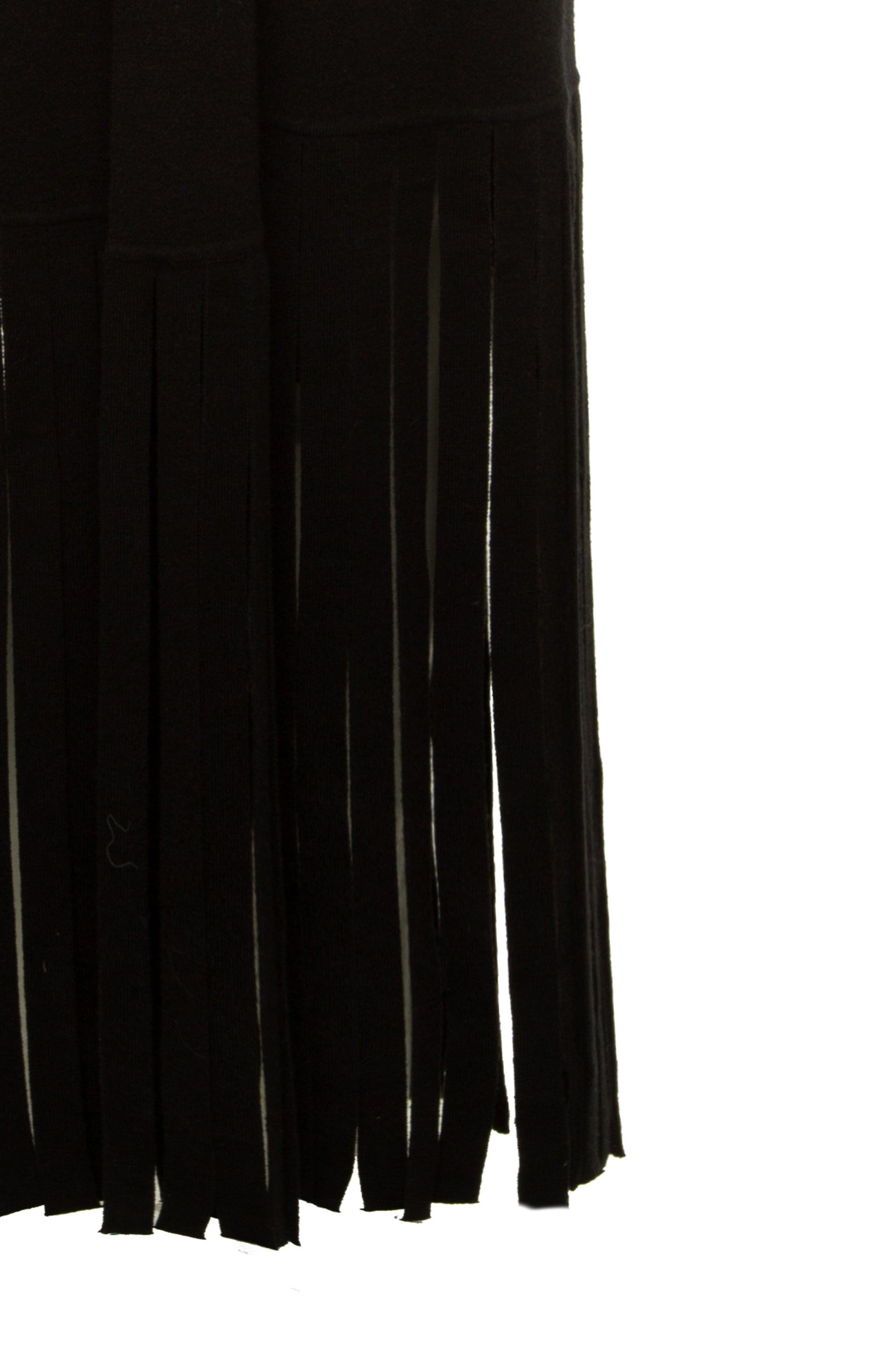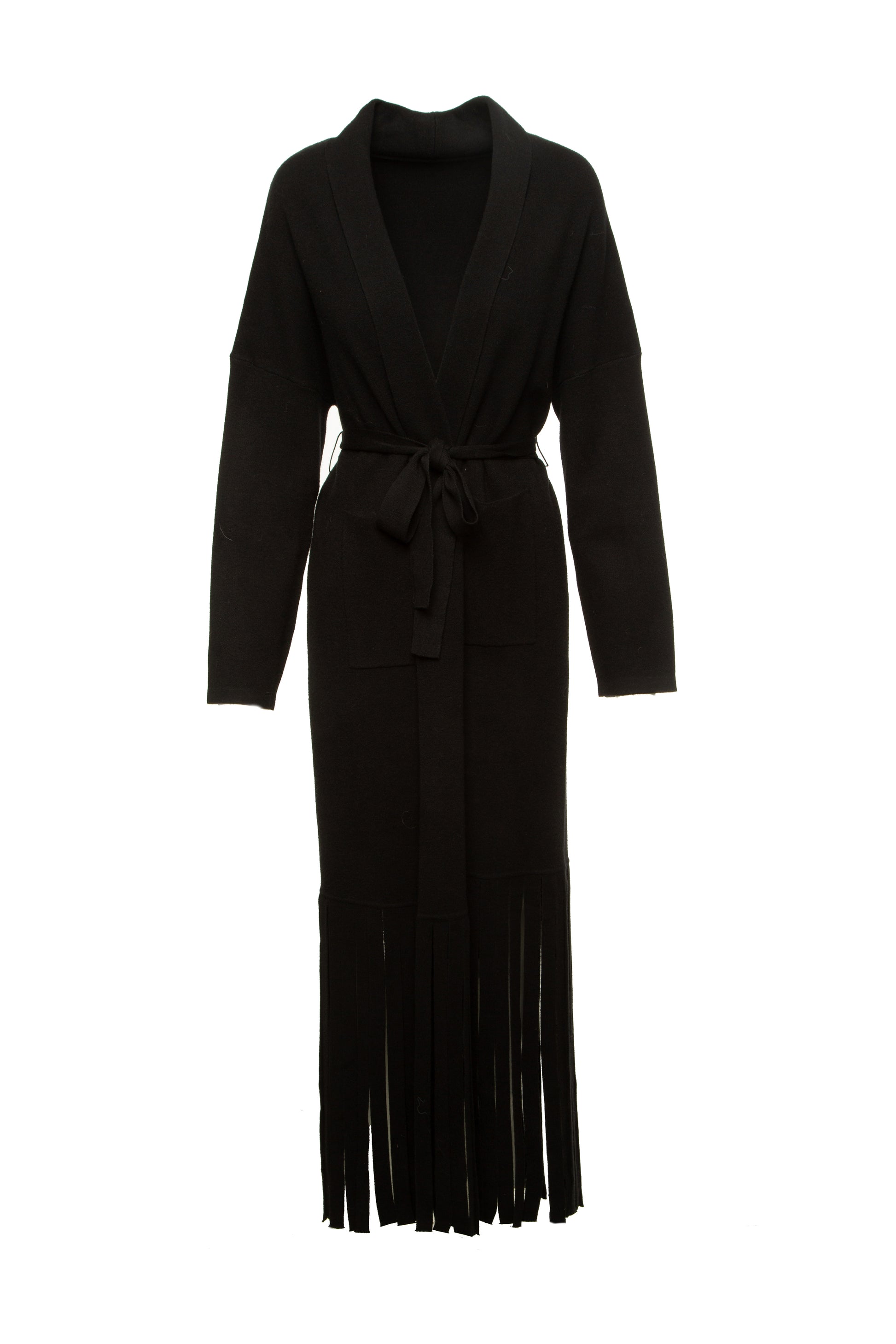Casaco comprido em malha preta, com cinto ajustável e franjas na bainha.