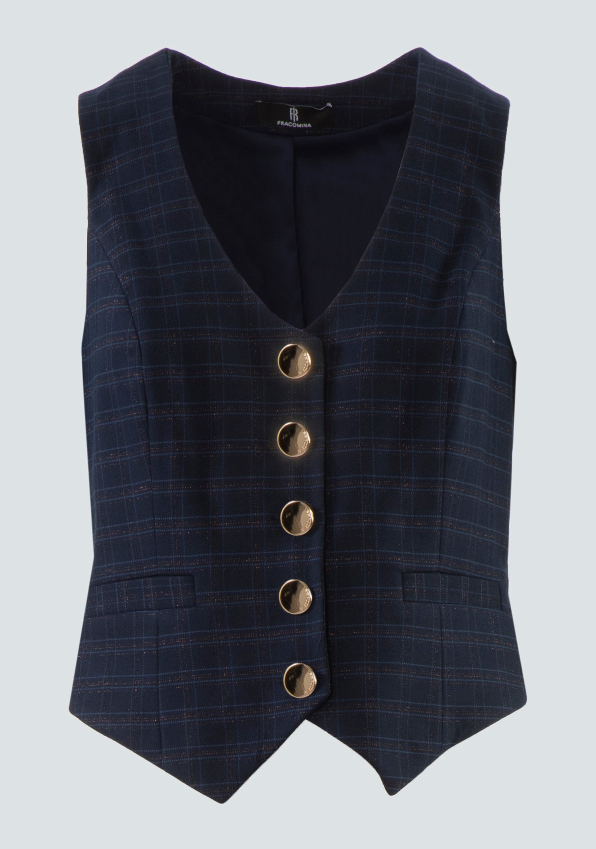 Colete azul marinho com padrão de quadrados e botões dourados.