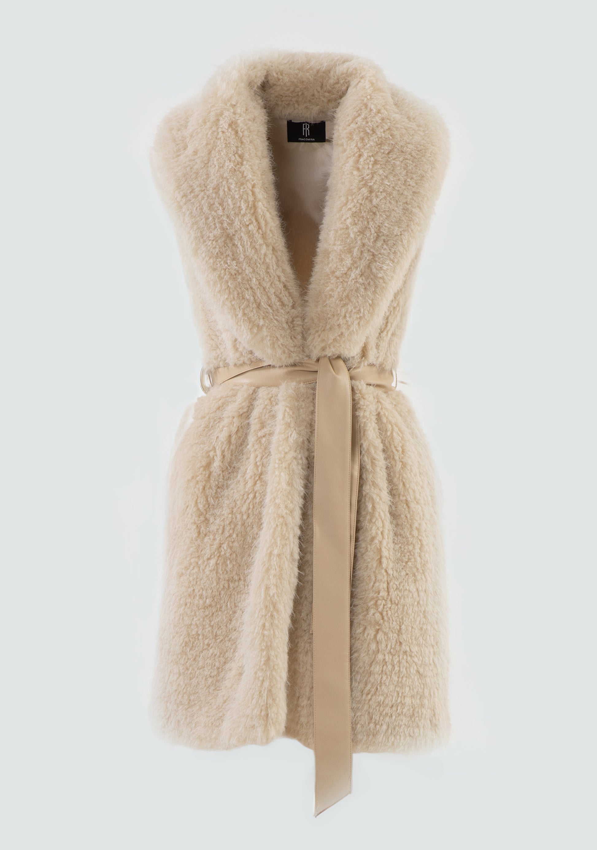 Colete comprido em pêlo sintético bege, com cinto para ajustar a silhueta e gola ampla.