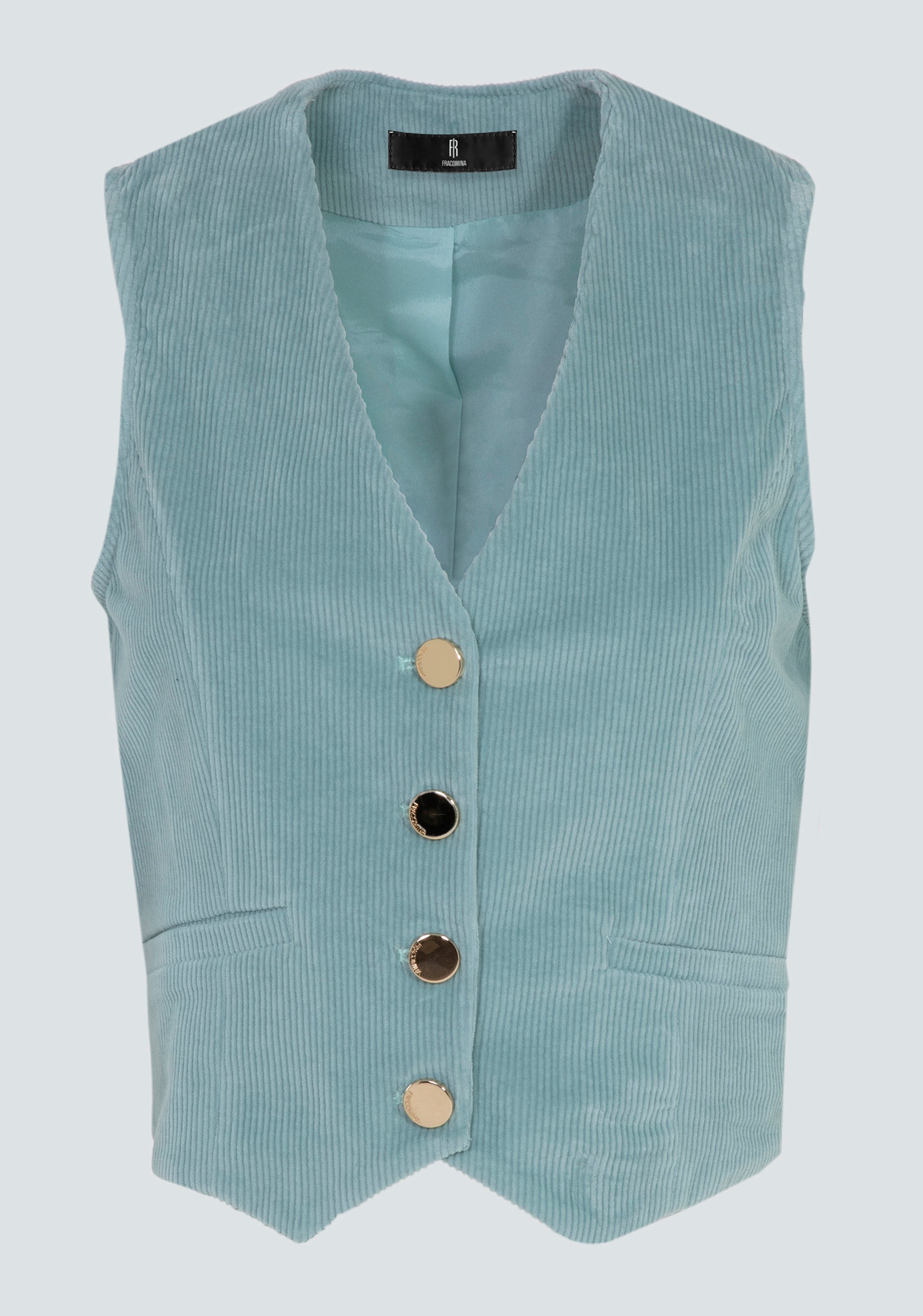 Colete de corte regular confecionado em bombazine. Decote em V, botões centrais para abertura, bolsos embutidos e cinto martingale nas costas.