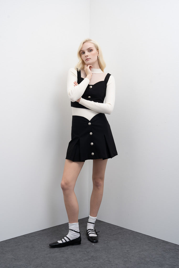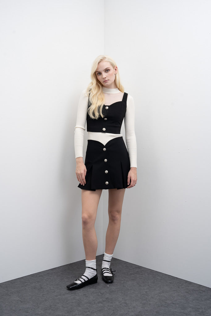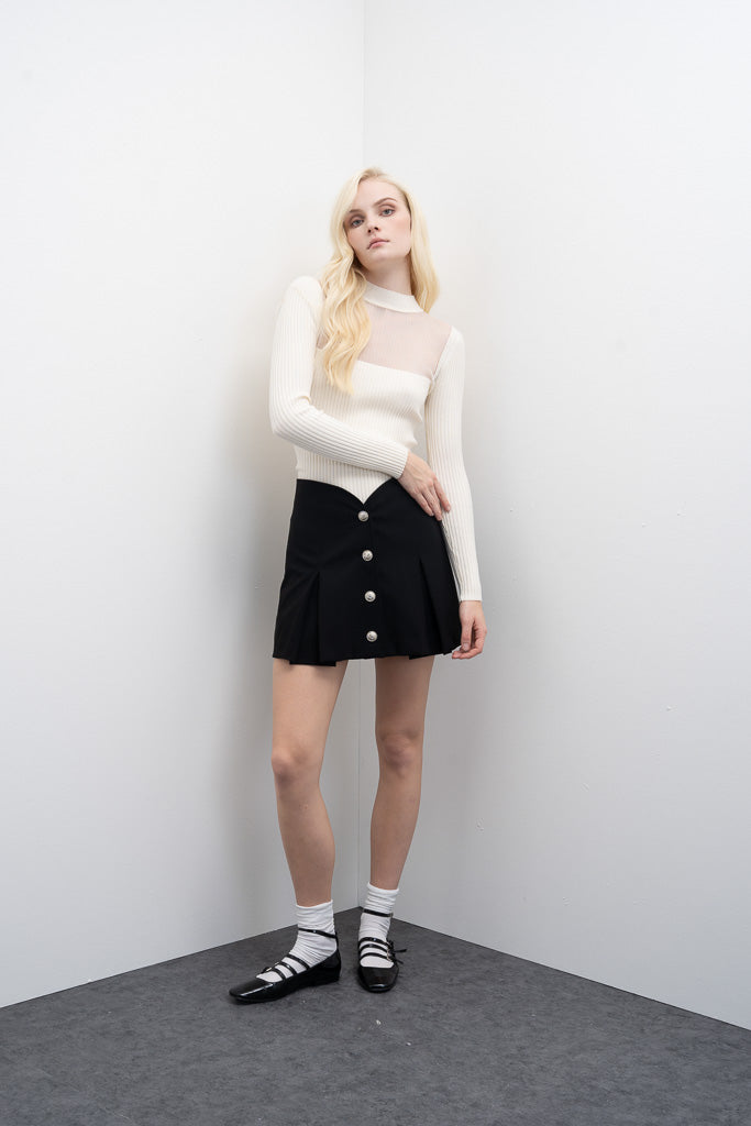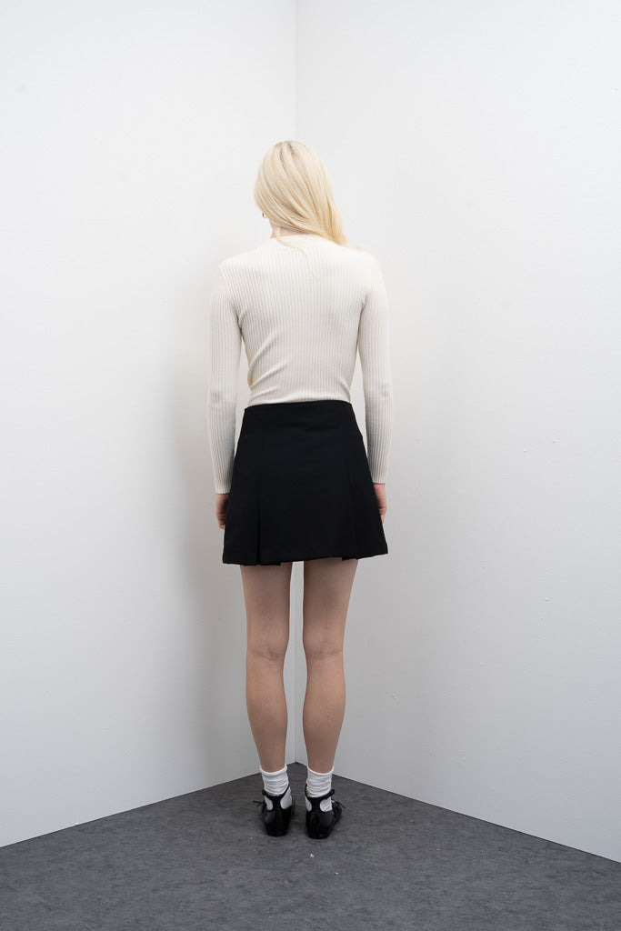 Saia curta preta com detalhe de botões prateados na parte frontal e pregas subtis que acrescentam movimento e elegância ao look. O corte em “A” valoriza a silhueta e oferece um toque moderno e feminino. Ideal para combinar com camisas, malhas ou tops ajustados.