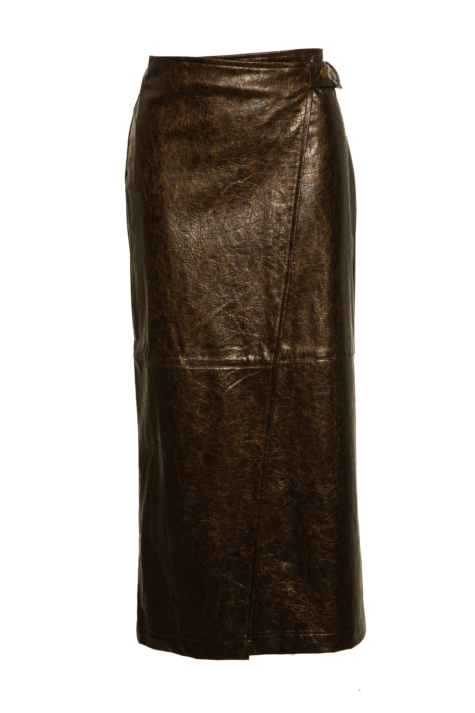 Saia midi com acabamento em efeito pele castanha e detalhe lateral com fecho de botão.
