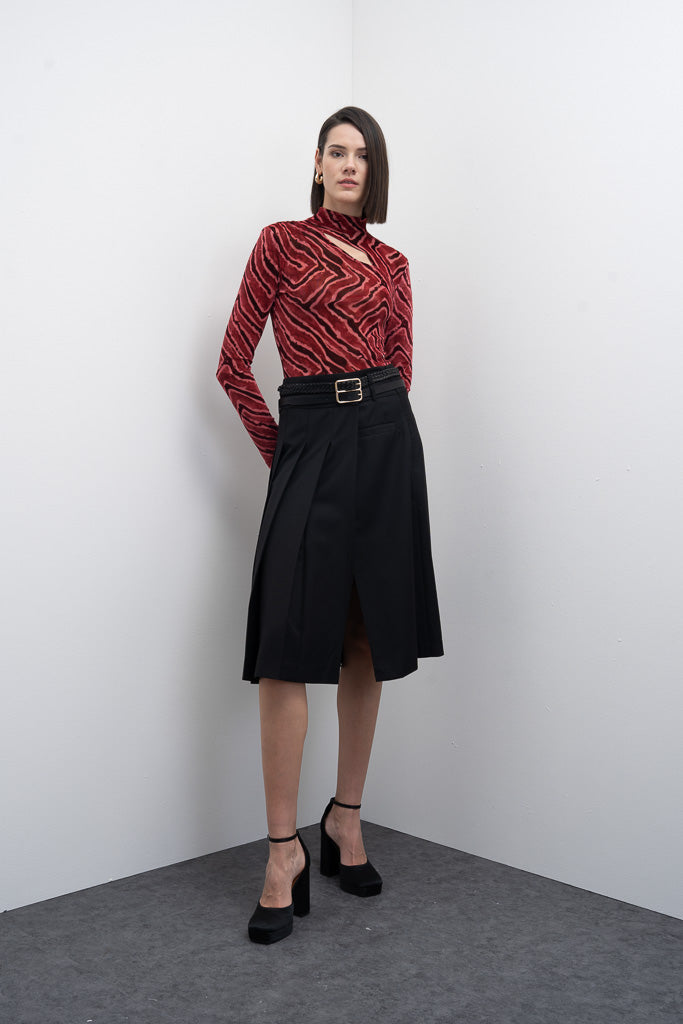 Saia midi preta com pregas amplas. Design fluido com movimento.