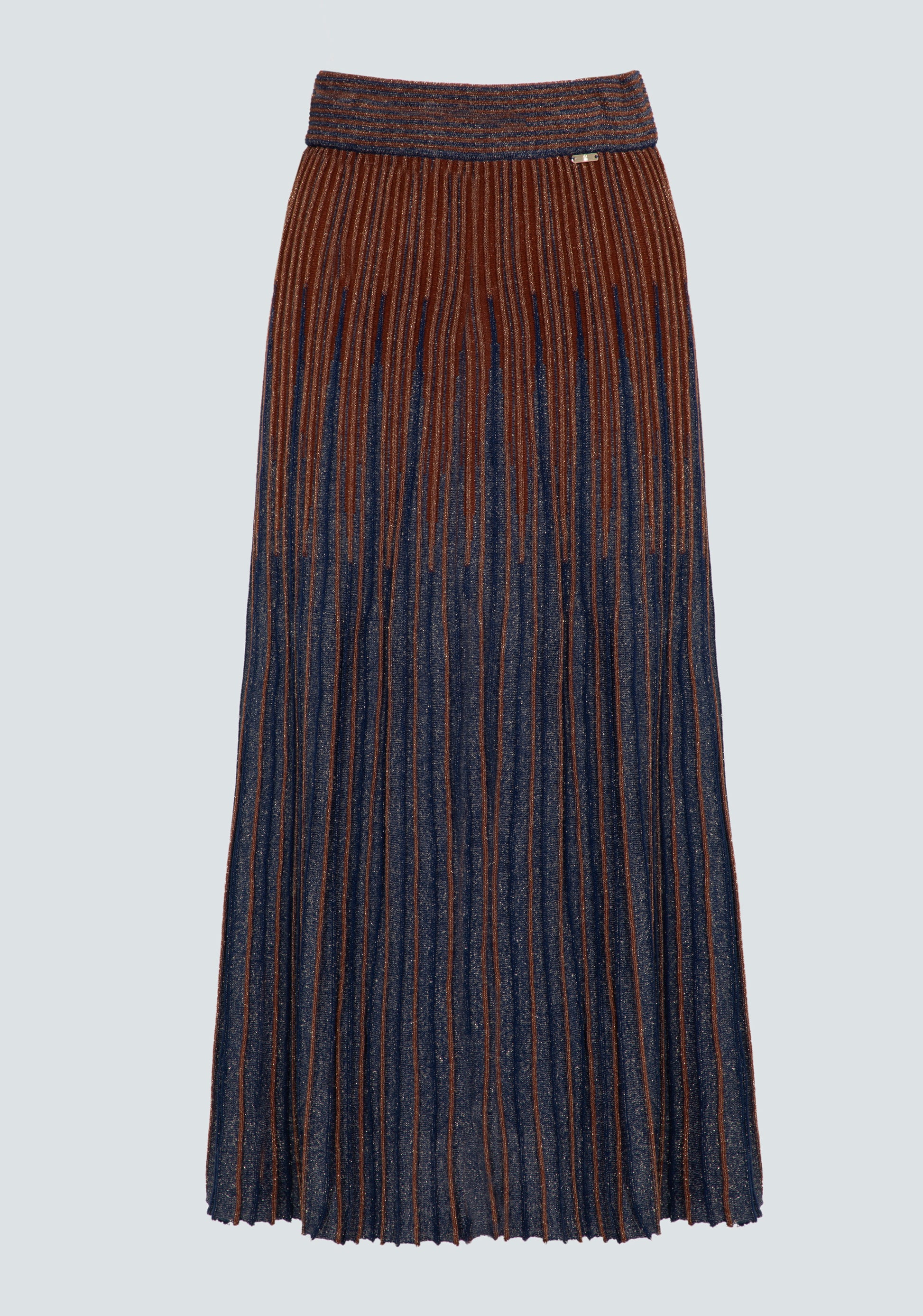 Saia midi plissada em luxrex com brilho. Com padrão em riscas verticais em azul e castanho, de cintura subida e caimento fluido.
