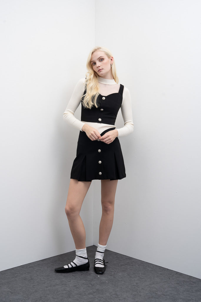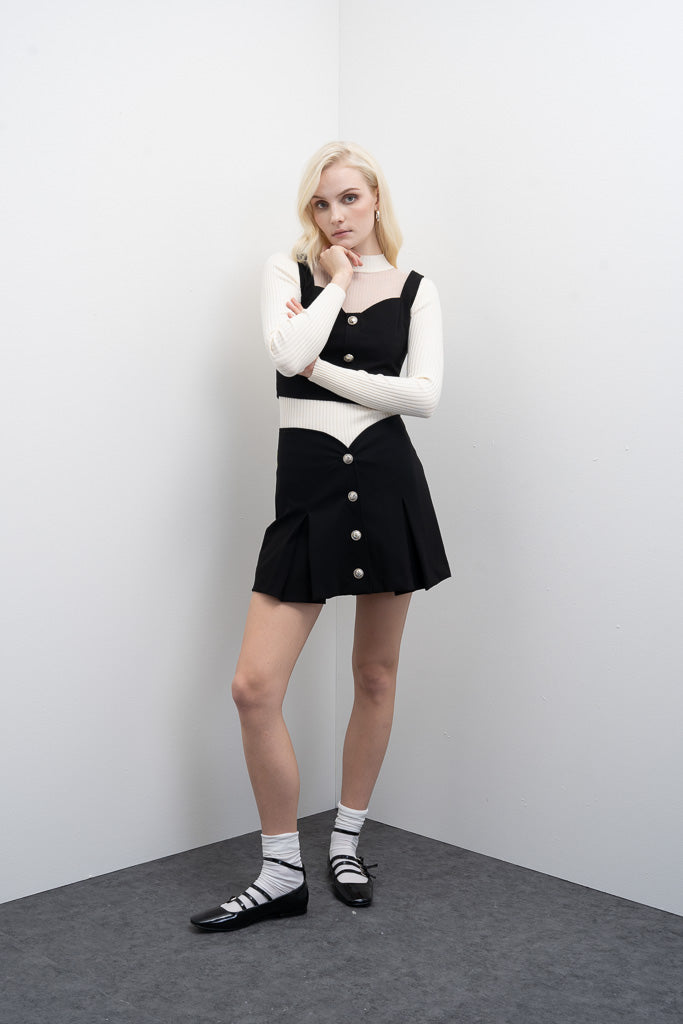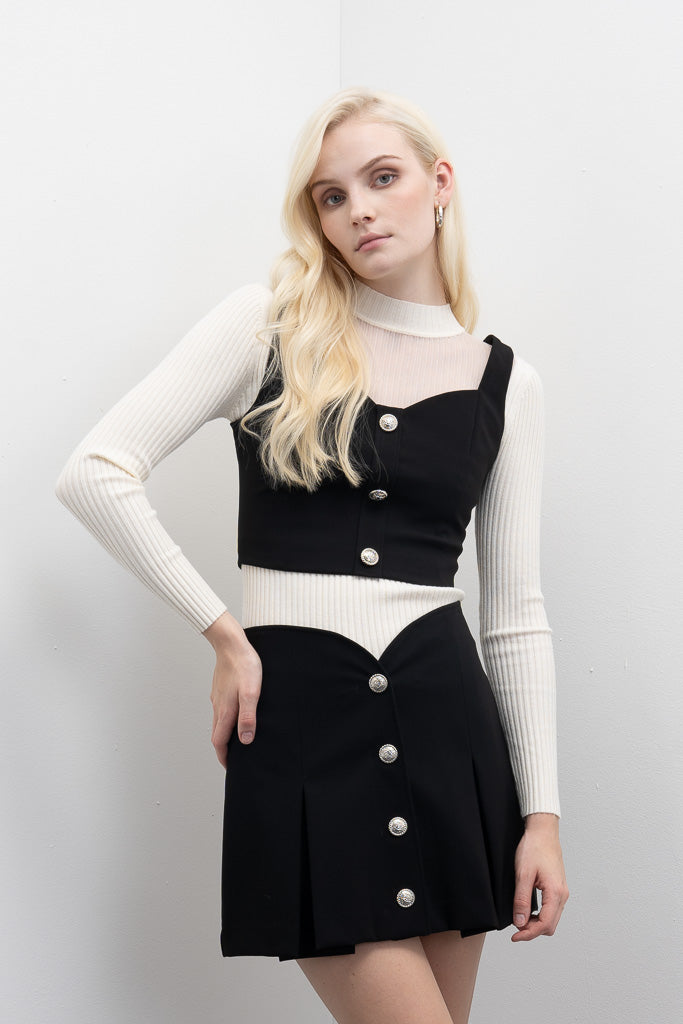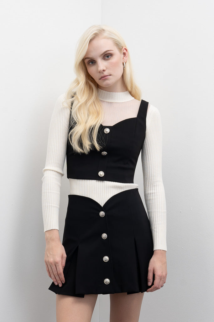 Top justo de alças largas em preto, com decote coração e fecho frontal com botões decorativos em tom prateado. A estrutura modeladora realça a silhueta, oferecendo um toque elegante e moderno.