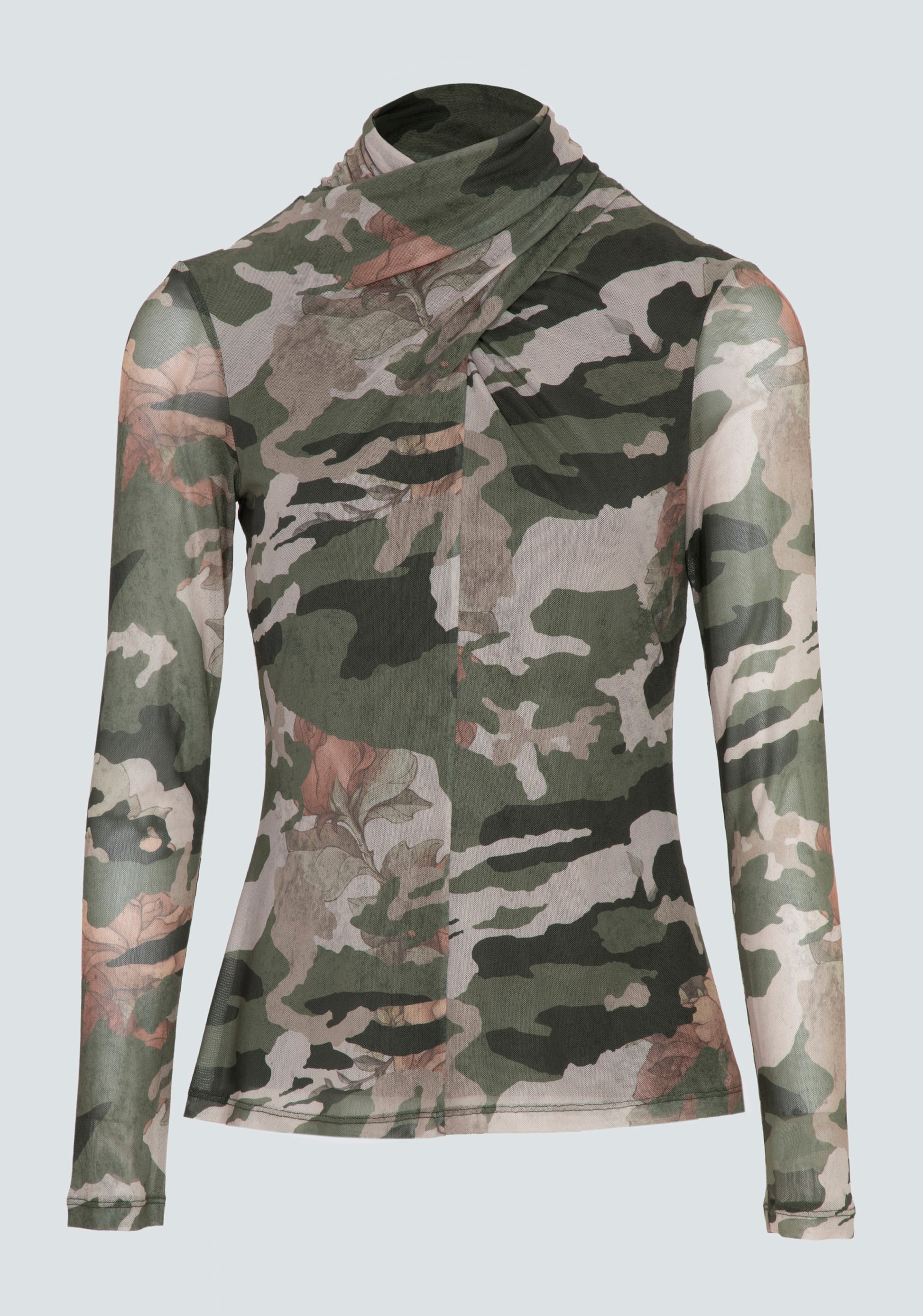 Camisola justa de manga comprida com estampado camuflado e detalhes florais subtis. Confeccionada em tecido leve e elástico, adapta-se perfeitamente à silhueta, garantindo conforto e estilo. O detalhe drapeado na gola adiciona um toque sofisticado e moderno. Ideal para combinar com calças, saias ou casacos neutros.