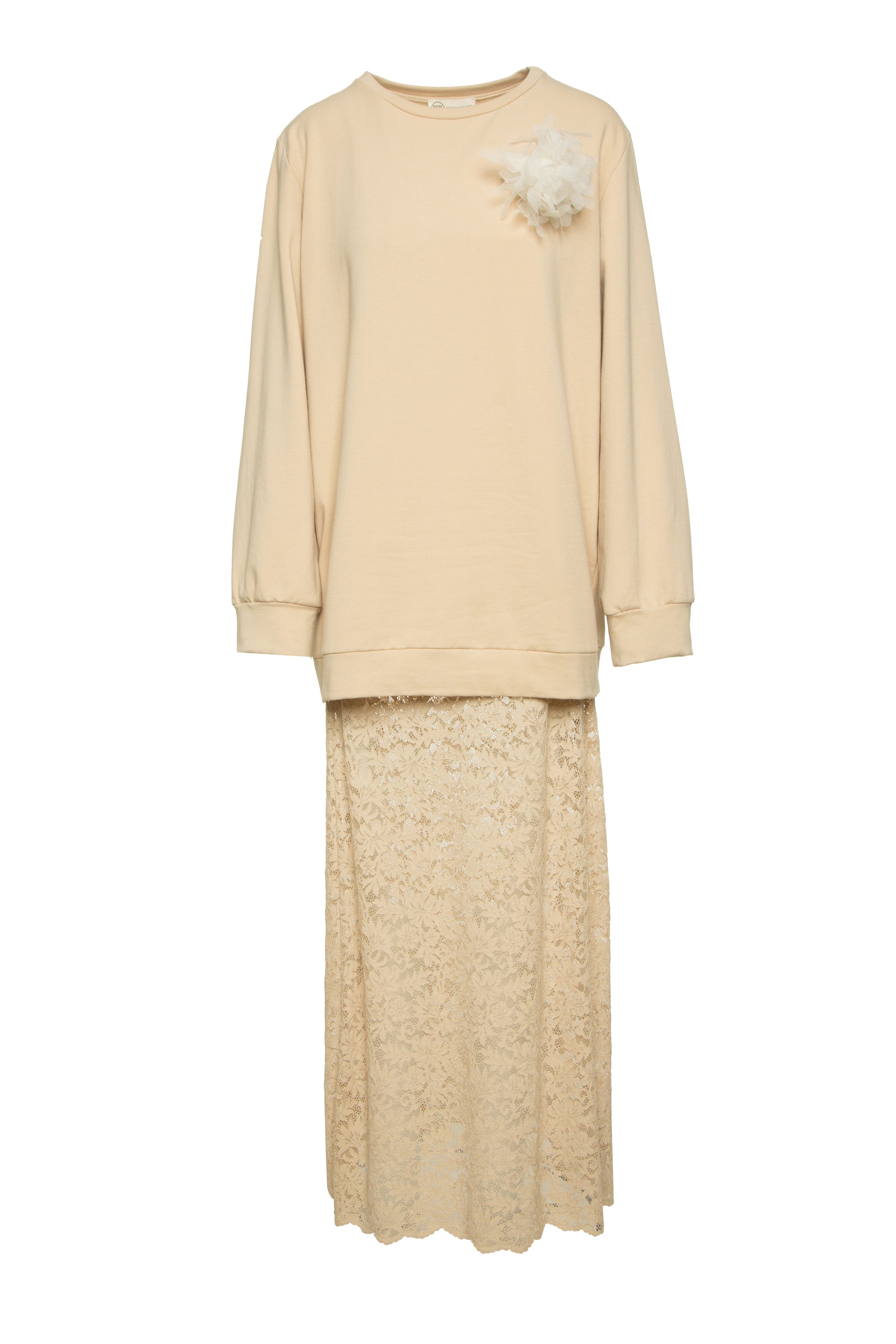 Vestido longo, mangas longas, decote redondo, estilo sweatshirt, com renda, corte regular, algodão